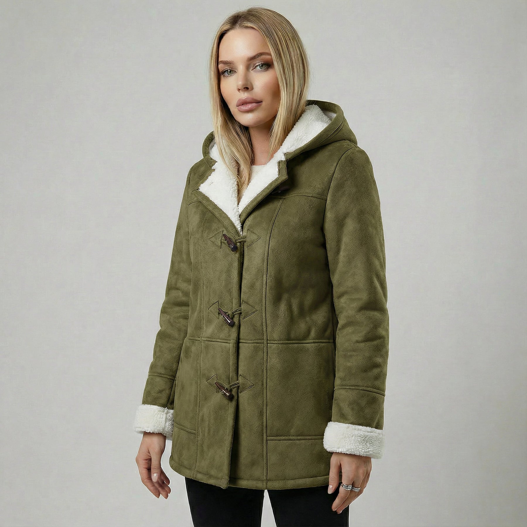 • Design élégant : Sa coupe simple et ses fermetures en bois apportent une touche de raffinement à votre look d'hiver.
