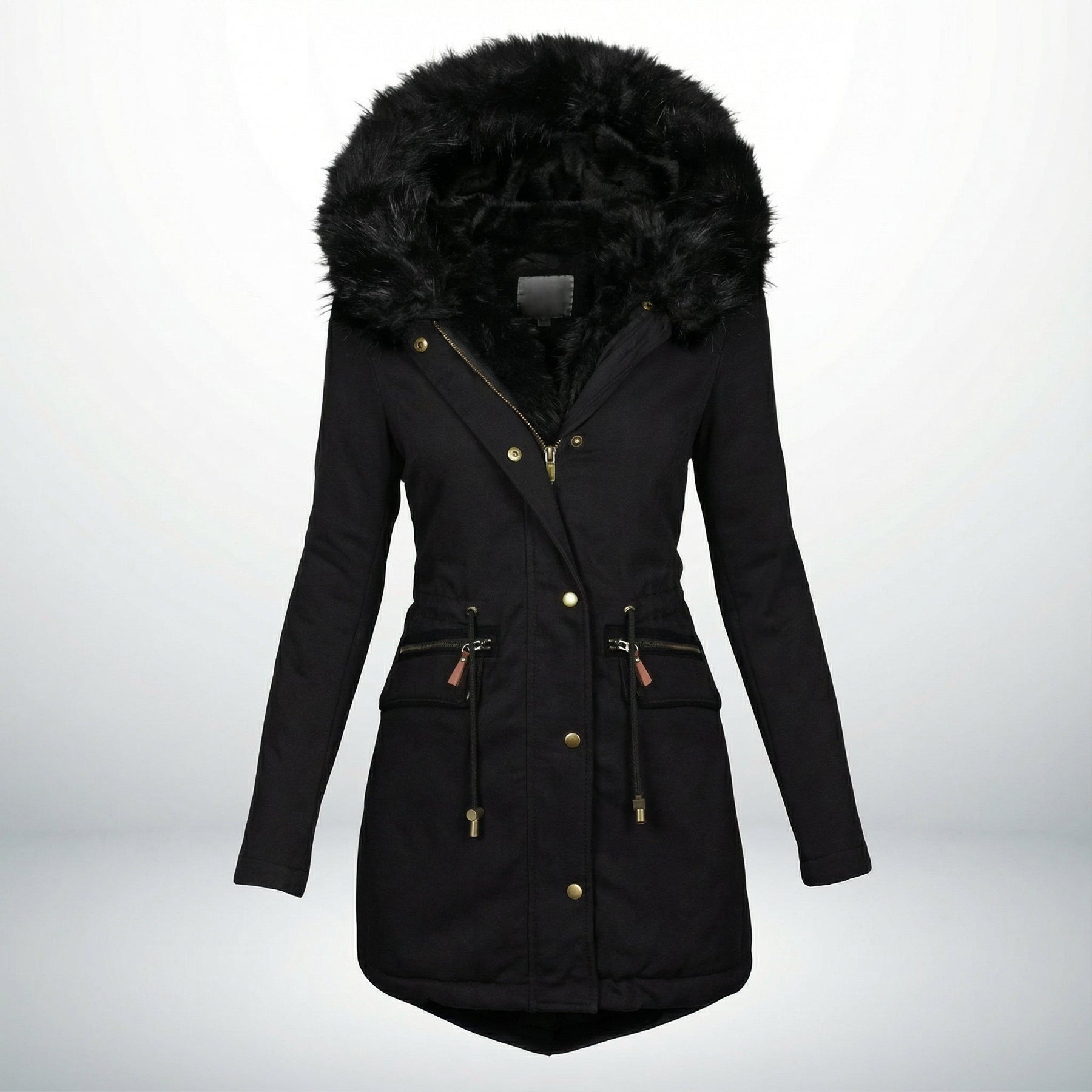 Cette parka à capuche en fausse fourrure vous offre une chaleur luxueuse et un look raffiné pendant les mois les plus froids. Son design pratique et ses détails dorés ajoutent une touche de sophistication, tandis que son rembourrage assure une protection optimale contre le froid.
